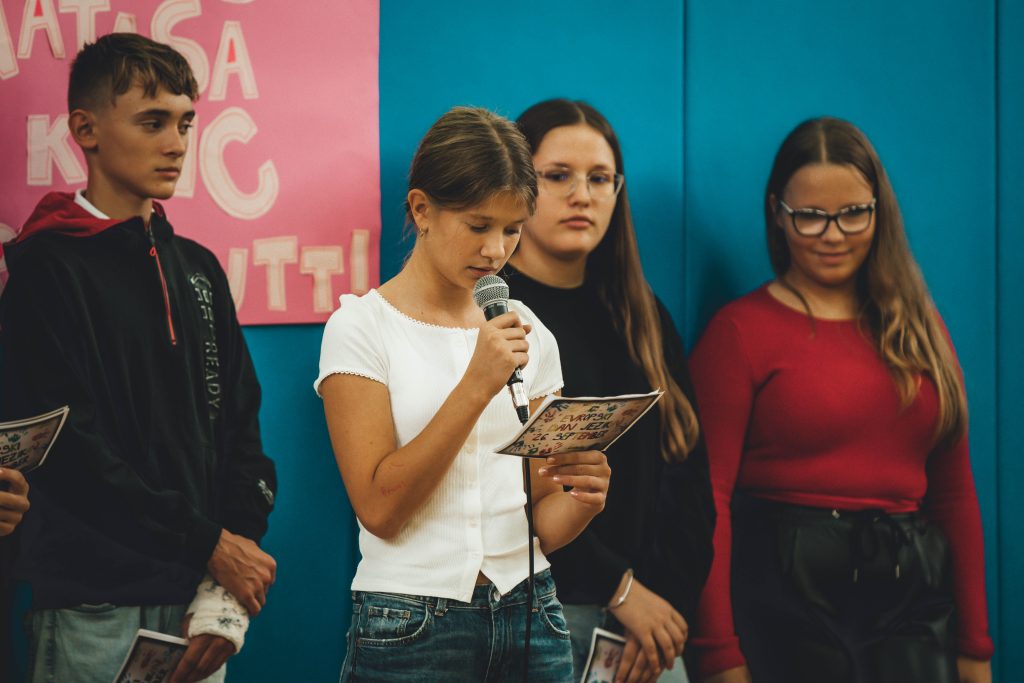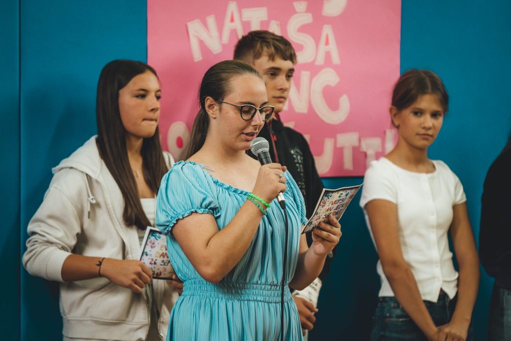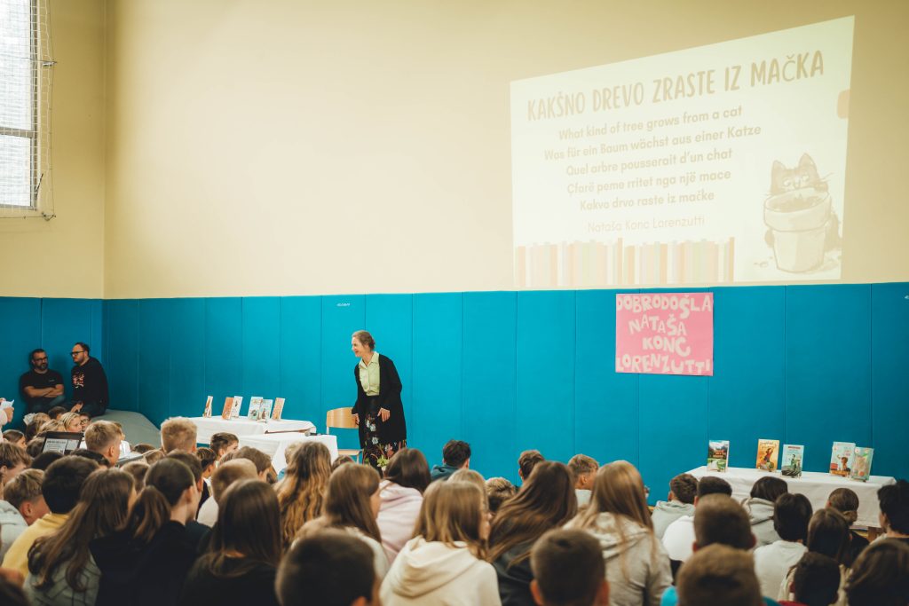 Dogodek smo obogatili s posebnim darilom – eno izmed njenih zgodb so učenci prevedli v jezike, ki jih govorijo na naši šoli. Tako je zgodba hkrati zazvenela v slovenščini, angleščini, nemščini, francoščini, albanščini, srbščini in ruščini. Projekcija izvirnega besedila in prevodov je ustvarila čudovito večjezično izkušnjo, ki je še posebej poudarila pomen evropskega dneva jezikov.