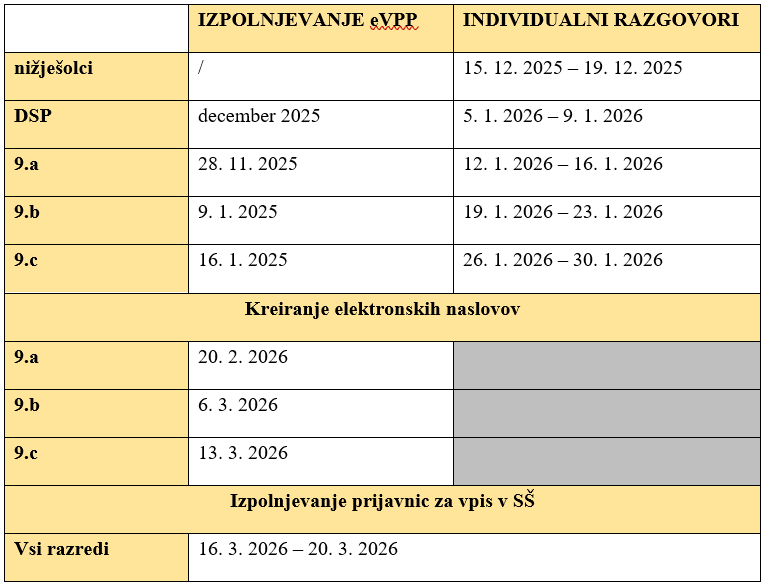 V mesecu januarju 2026 vas bomo skupaj s starši povabili v šolo na individualne svetovalne pogovore, kjer se bomo pogovorili o vaših željah in namerah ter se podrobneje seznanili z rokovnikom.