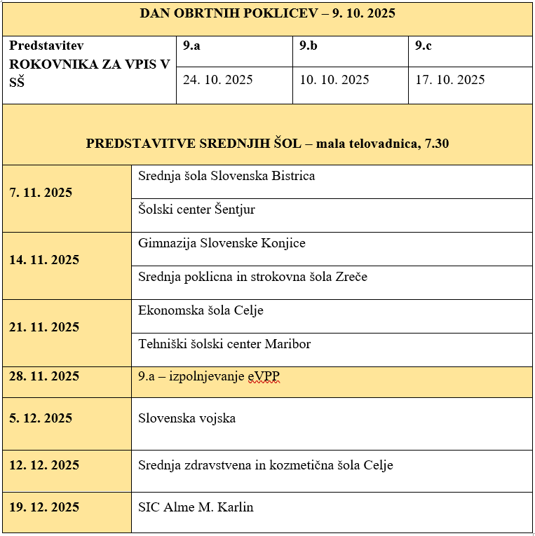 Na OŠ Ob Dravinji v mesecu novembru 2025 pričenjamo s predstavitvami srednjih šol in drugimi dejavnostmi po naslednjem razporedu: